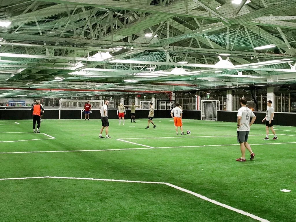 Indoor soccer field with players practicing or playing, some standing near the goal, others spread across the field, with a roof structure overhead.
